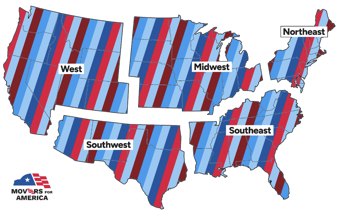 There are openings for three individuals per region (map below). To advance policies that best serve all professionals who service military household shipments, moving professionals at all levels of experience and roles within the industry are encouraged to express interest.